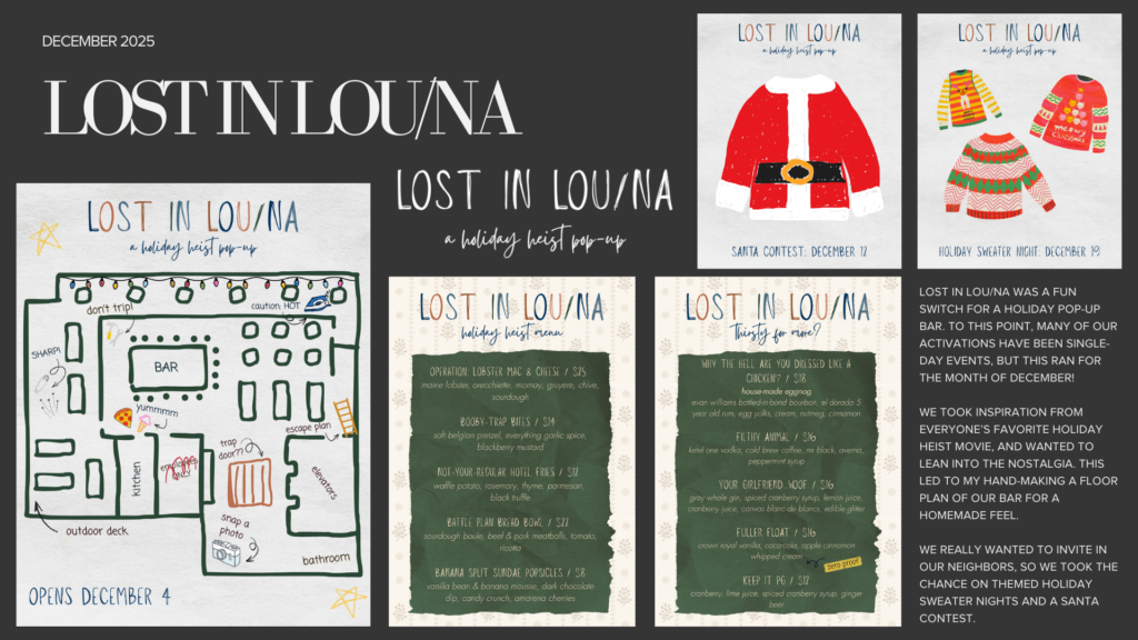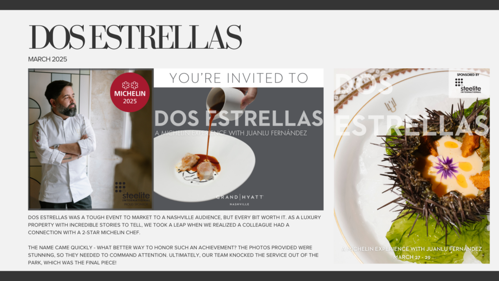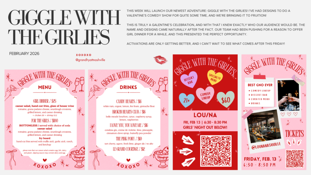 I also manage the content calendars for the Holston House LinkedIn, Facebook page, and Instagram (@holston_house_nashville) as well as the Facebook pages for TENN Nashville and Heirloom Rooftop Lounge and their corresponding Instagram pages (@tenn_nashville and @heirloomrooftop).